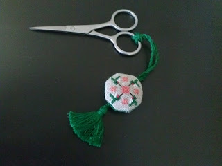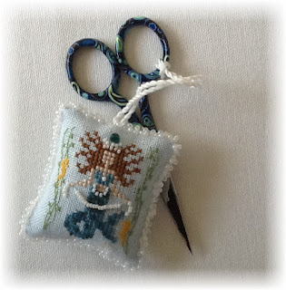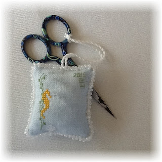 Of course my small of choice is a scissor fob. I knew what I wanted the fob to say but in order to fit it in I had to ...sigh... stitch over one....again. There are only two things I like about stitching over one, getting done with it and the end result which makes the effort worthwhile.