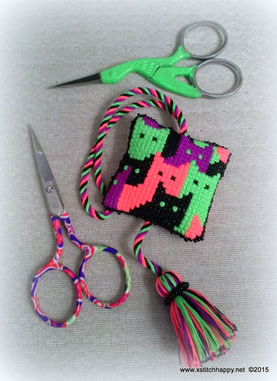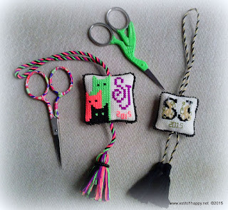 Next is the Neon Cats scissors fob based on a knitting pattern of repeating cats that I saw online. I had to make some changes to make it work for me but I was pleased with the result and I loved the bright neon colored floss which was unexpectedly wonderful to stitch with. Stitched on the same 25ct Potato Lugana except this one is stitched over two threads! Yay!